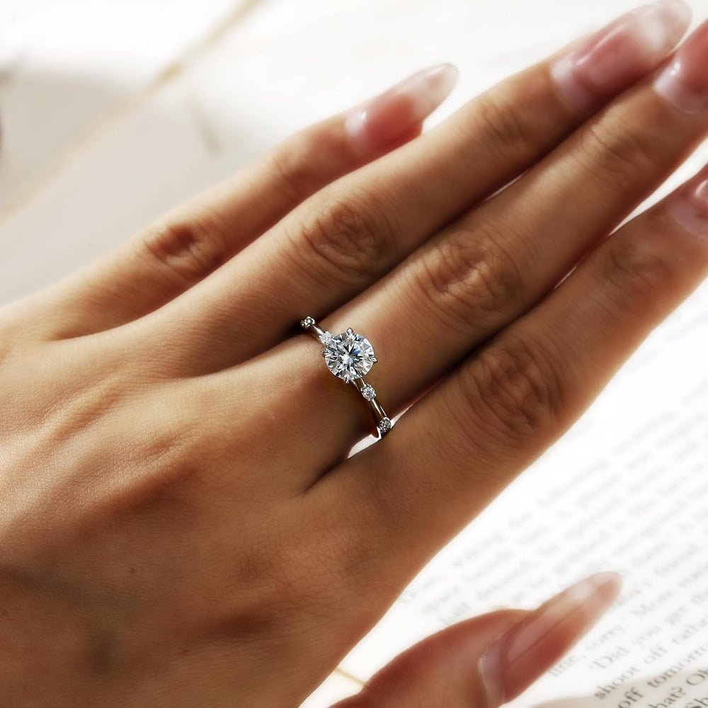 DETAILS: A harmonious blend of classic and contemporary, this ring features a 1.0 carat round Lab Grown Diamond center stone and 0.1 carat side stones with VS clarity and FG color.
